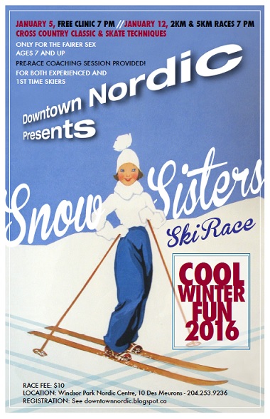Entitled the Snow Sisters Ski Event, the clinic will take place on Tuesday January 5, 2016.  The “race” will be the following Tuesday, January 12, 2016.  You may choose to ski 2k, 4k or 6k in either classic or skate technique.  Cost is $10.